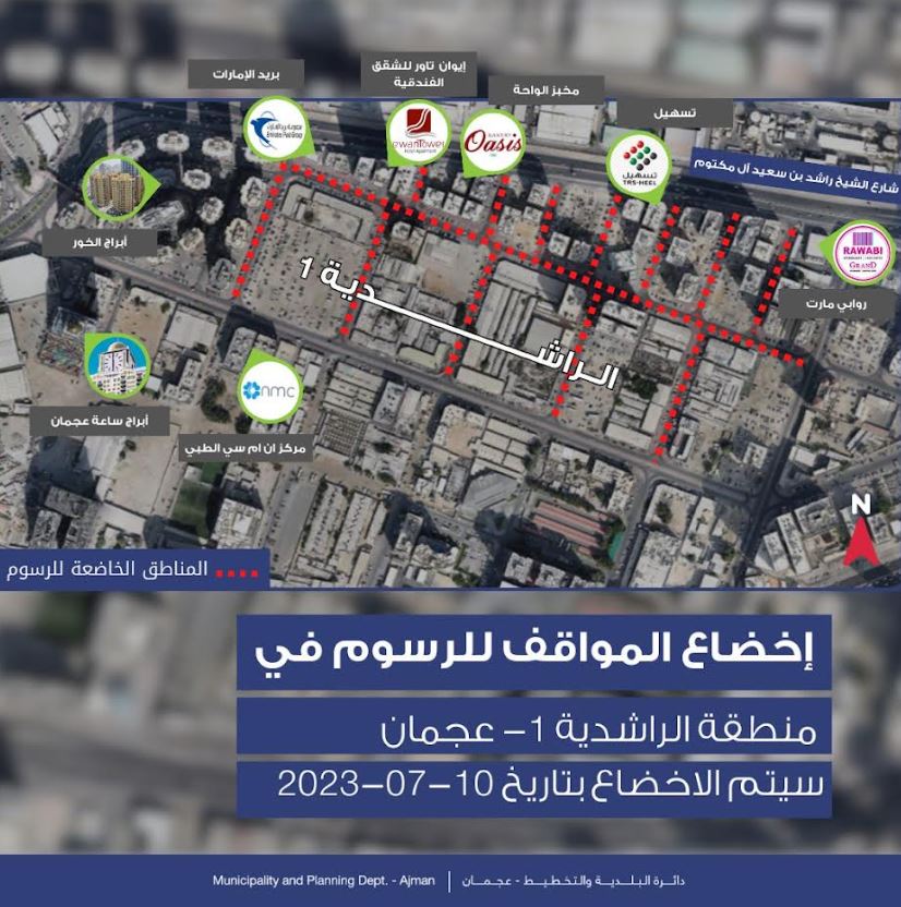 أفادت دائرة البلدية والتخطيط في عجمان، بأنه سيتم إخضاع المواقف للرسوم في منطقة الراشدية 1 بعجمان يوم 10 يوليو الجاري.