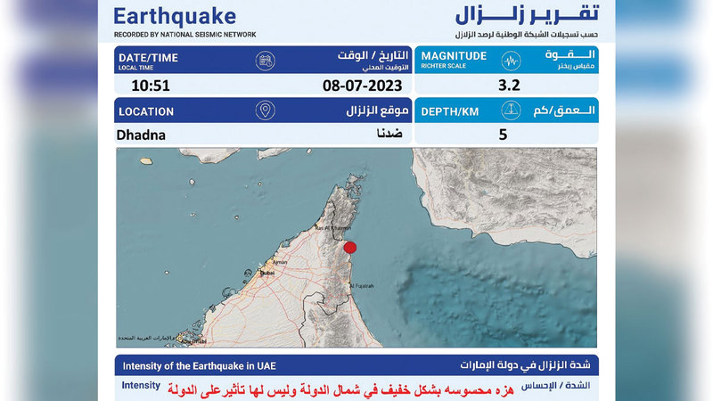 سجلت محطات الشبكة الوطنية لرصد الزلازل، التابعة لـ«المركز الوطني للأرصاد»، أمس، هزة أرضية بقوة 3.2 درجات على مقياس ريختر في «ضدنا»، الساعة 10:51 صباحاً، شعر بها بعض السكان بشكل خفيف في شمال الدولة، دون أن يكون لها أي تأثير.