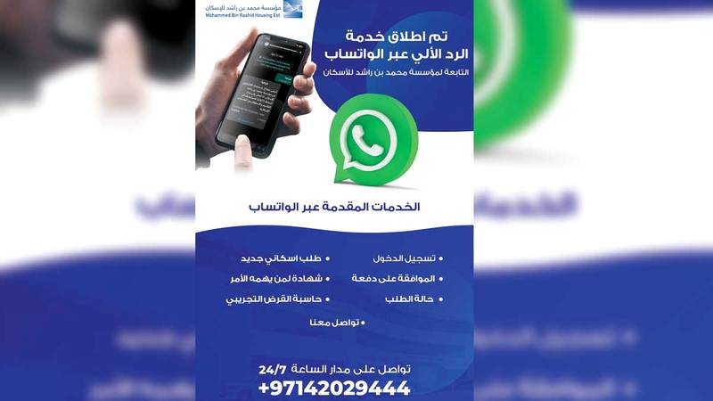أعلنت «مؤسسة محمد بن راشد للإسكان» عن إطلاق خدماتها عبر تطبيق «واتس أب»، لتبسيط الإجراءات المتعلّقة بالإسكان وتعزيز وصول المستفيدين إليها، وتعتبر هذه الخدمة، الإضافة الأحدث ضمن جهود المؤسسة المستمرة لإثراء تجربة عملائها وتعزيز قنوات تواصلها مع مواطني الإمارة وجميع المستفيدين من خدماتها.