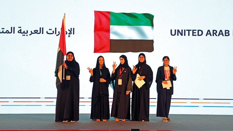ريم راشد (يمين) مع الفريق الإماراتي المشارك. من المصدر