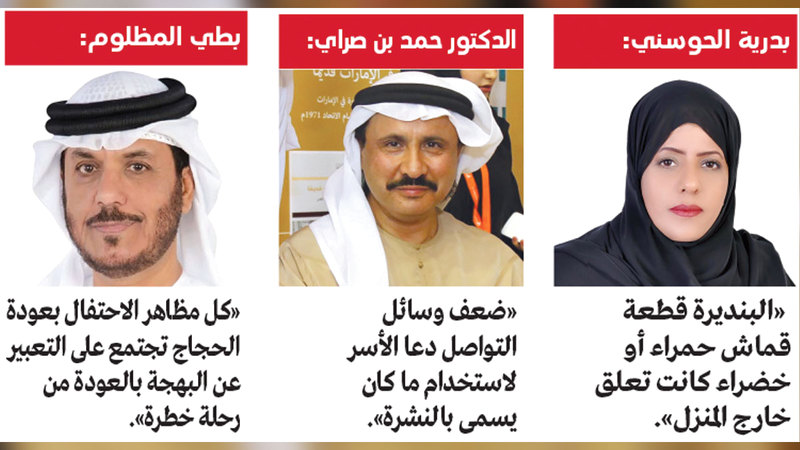 وتابع أن كلمة «حجي» و«حجية» التي تطلق على من أدى فريضة الحج، ذات قيمة كبيرة، لأن حاملي هذا اللقب الكريم عادوا من الديار المقدسة وهم طاهرون، كما ولدتهم أمهاتهم. أما الباحثة في التراث الثقافي، بدرية الحوسني، فذكرت أن رواة المنطقة أكدوا أن الأسر كانت تعلق «البنديرة»، وهي قطعة قماش حمراء أو خضراء خارج المنزل، رمزاً لعودة الحاج سالماً إلى منزله بعد أدائه فريضة الحج. وكانت الأسر تستقبل الحجاج بالنثور، وهي عبارة عن نقود وحلويات قديمة كانت تباع بالدكاكين، إلى جانب أوراق الريحان والمشموم. وتابعت الحوسني: «كان الحاج يوزع الهدايا البسيطة التي أتى بها من مكة المكرمة، وهي عبارة عن قوارير صغيرة للكحل (الإثمد)، وسجاجيد الصلاة، وماء زمزم». وقال الخبير في التراث، بطي بن سالم المظلوم، إن كل مظاهر الاحتفال بعودة الحجاج على اختلاف تفاصيلها من بيئة إلى أخرى تجتمع على التعبير عن البهجة بقدوم الحاج من رحلة كانت تتسم بالخطورة والمشقة. ولفت إلى أن رحلة الحج لم تكن أمراً هيناً، فالقليل من الأشخاص من كانوا يتمكنون من الخروج لأداء هذه الفريضة.