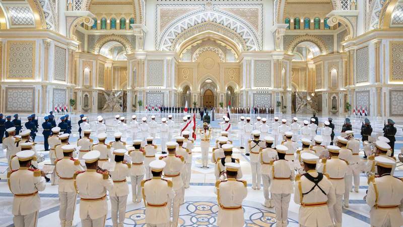 واصطحب صاحب السمو الشيخ محمد بن زايد آل نهيان، ضيف البلاد إلى منصة الشرف؛ حيث عُزف السلام الوطني للبلدين.