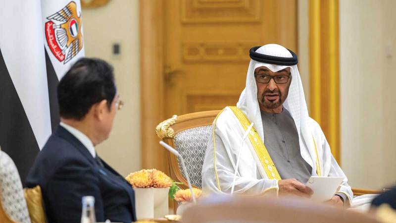 جاء ذلك خلال جلسة المحادثات التي عقدها صاحب السمو رئيس الدولة، أمس، في قصر الوطن، مع فوميو كيشيدا، الذي يقوم بزيارة رسمية لدولة الإمارات.
