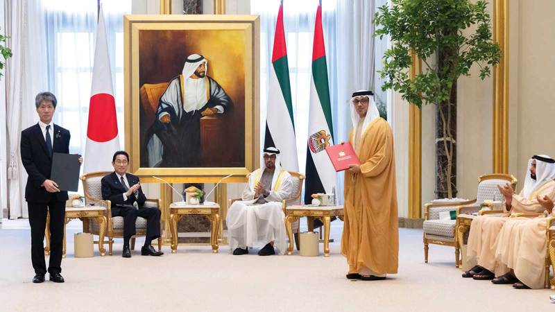 وخلال الزيارة، شهد صاحب السمو الشيخ محمد بن زايد آل نهيان، وفوميو كيشيدا تبادل مذكرات تفاهم واتفاقيات تهدف إلى تطوير الشراكة الاستراتيجية الشاملة بين البلدين وتنويع مجالاتها.