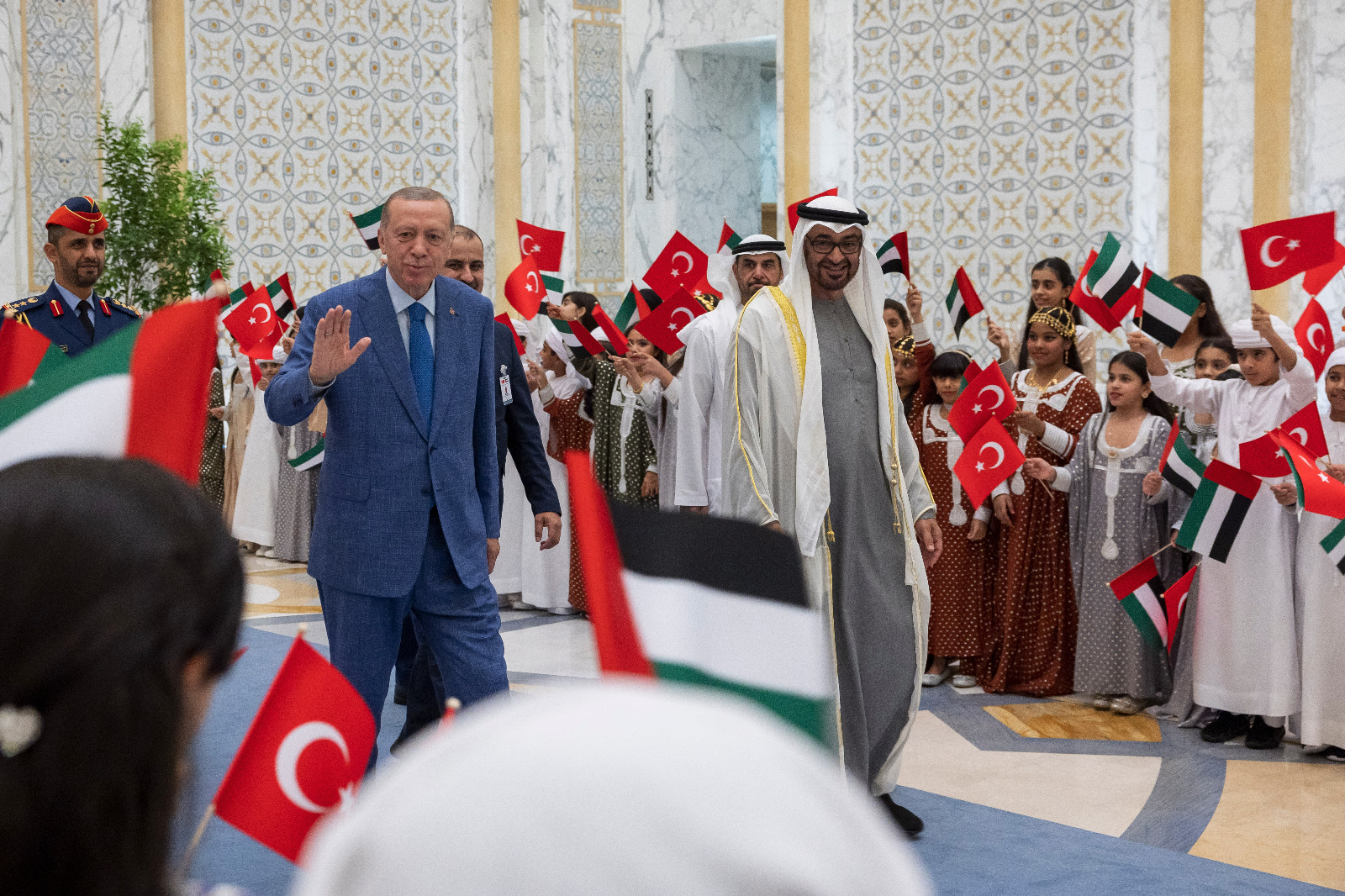 وجرت لفخامة الرئيس التركي مراسم استقبال رسمية ــ لدى وصول موكبه قصر الوطن في العاصمة أبوظبي ــ حيث أطلقت المدفعية 21 طلقة واصطفت ثلة من حرس الشرف تحية لفخامته.. كما اصطفت مجموعة من الأطفال يلوحون بأعلام البلدين مرددين عبارات ترحيبية بضيف البلاد.