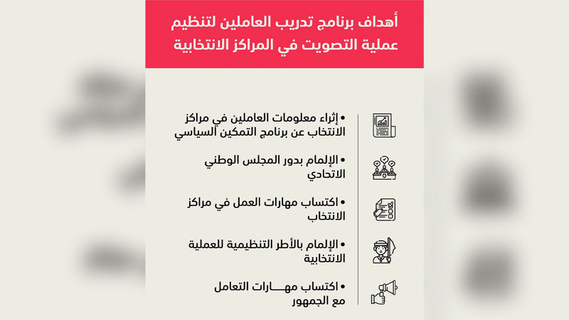 وأكدت اللجنة أن المشاركين في تنظيم عملية التصويت سوف يكتسبون بعد الانتهاء من البرنامج عدداً من المهارات، أهمها: إثراء معلوماتهم عن برنامج التمكين السياسي الذي أطلقه المغفور له - بإذن الله تعالى- الشيخ خليفة بن زايد آل نهيان «رحمه الله»، إضافة إلى الإلمام بدور المجلس الوطني الاتحادي، واكتساب مهارات العمل في مراكز الانتخاب، علاوة على الإلمام بالأطر التنظيمية للعملية الانتخابية، فضلاً عن اكتساب مهارات التعامل مع الجمهور.