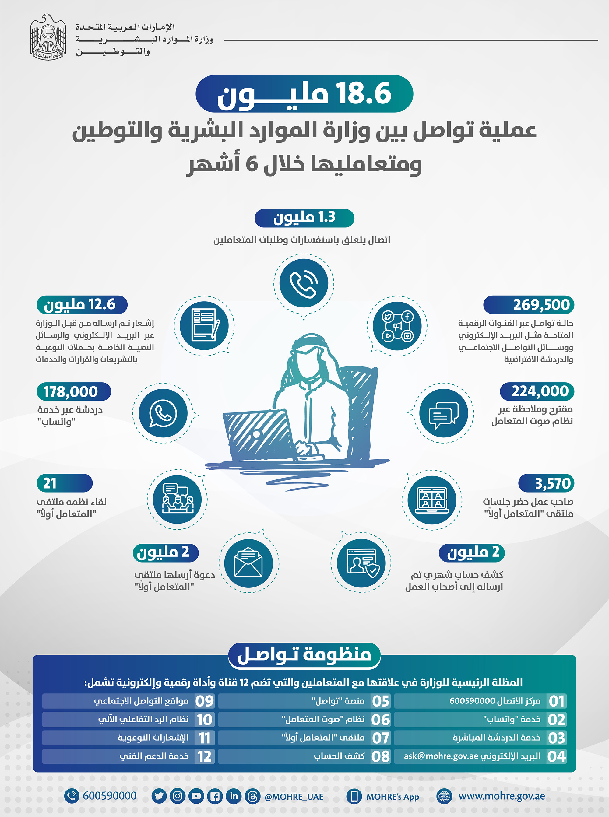 ووفقاً للوزارة تضم قنوات منظومة "تواصل" مركز الاتصال 600590000، وخدمة "واتساب"، وخدمة الدردشة المباشرة عبر الموقع الإلكتروني والتطبيق الذكي، والبريد الإلكترونيask@mohre.gov.ae ، إلى جانب منصة "تواصل" في مكاتب وزارة الموارد البشرية والتوطين، والتي تتيح المكالمات المرئية والصوتية مع المتعاملين ونظام "صوت المتعامل" وملتقى "المتعامل أولاً" - إضافة لحسابات الوزارة على مواقع التواصل الاجتماعي@mohre_uae ، ونظام الرد التفاعلي الآلي، والإشعارات التوعوية لأصحاب العمل والموظفين، وخدمة كشف الحساب الشهري للمنشآت.