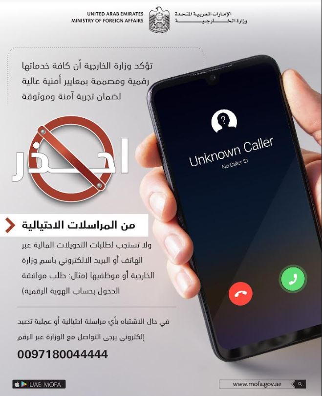 حذرت وزارة الخارجية الأفراد من مراسلات احتيالية تستهدف تصيد الأفراد والحصول على أموالهم، داعية إلى عدم الاستجابة لطلبات التحويلات المالية عبر الهاتف أو البريد الإلكتروني باسم وزارة الخارجية أو موظفيها، ومثال على ذلك طلب موافقة الدخول بحساب الهوية الرقمية.