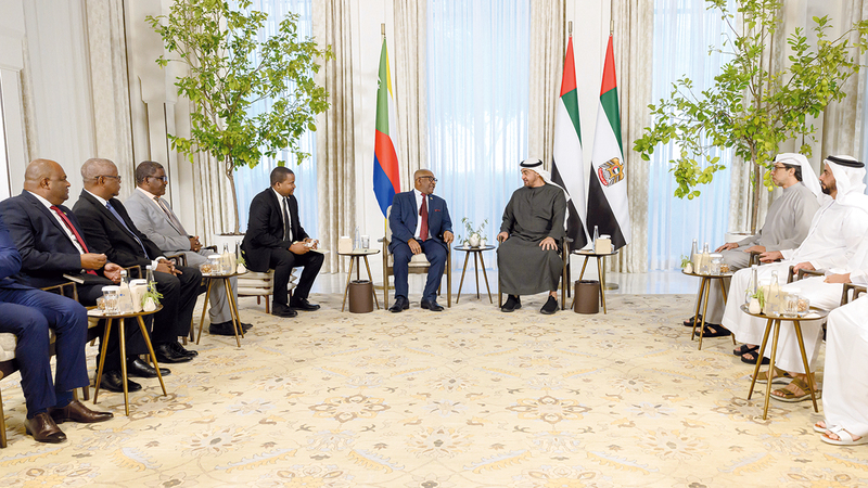 استقبل صاحب السمو الشيخ محمد بن زايد آل نهيان، رئيس الدولة، أمس، رئيس جمهورية القمر المتحدة، رئيس الدورة الحالية للاتحاد الإفريقي غزالي عثماني الذي يقوم بزيارة عمل إلى الدولة.