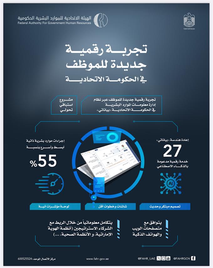 بدأت الهيئة الاتحادية للموارد البشرية الحكومية في تطبيق المرحلة الأولى من التجربة الرقمية الجديدة للموظف في الحكومة الاتحادية، والتي تقدم 27 خدمة رقمية سهلة وسلسة لمسؤولي وموظفي الحكومة الاتحادية، مدعومة بأحدث تقنيات الذكاء الاصطناعي، حيث يسهم المشروع في تبسيط وتسريع التجربة الرقمية للموظف بنسبة 55% من خلال التكامل المعلوماتي والربط الإلكتروني مع نظام الهوية الإماراتية، والأنظمة الصحية في الدولة.