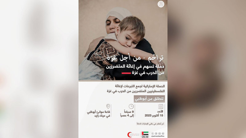 تبدأ اليوم في أبوظبي أولى مراحل حملة «تراحم من أجل غزة»، التي أطلقتها دولة الإمارات العربية المتحدة لإغاثة الأشقاء الفلسطينيين المتأثرين من الحرب في قطاع غزة. وتنطلق الحملة تحت إشراف هيئة الهلال الأحمر الإماراتي في قاعة موانئ أبوظبي بميناء زايد من الساعة التاسعة صباحاً إلى الرابعة عصراً، على أن يتم تنظيمها في بقية الإمارات لاحقاً.