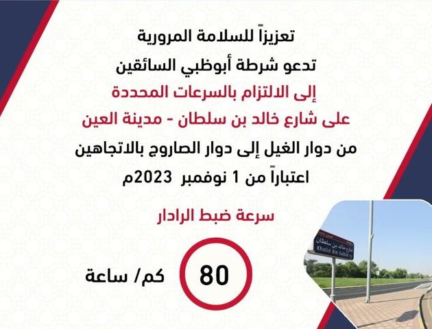 أعلنت شرطة أبوظبي تخفيض السرعة إلى 80 كم / ساعة على شارع الشيخ خالد بن سلطان بمدينة العين ، وذلك تعزيزاً للسلامة المرورية اعتباراً من 1 نوفمبر 2023م.