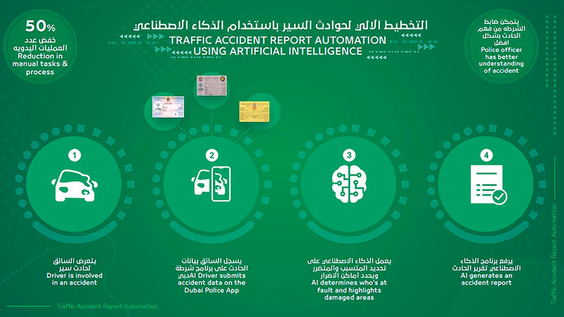 طوّرت شرطة دبي تقنية جديدة تعتمد على الذكاء الاصطناعي في تحليل حوادث السير، وتحديد الطرفين المتسبب والمتضرر، وإصدار التقرير بشكل فوري للسائقين دون تدخل بشري.