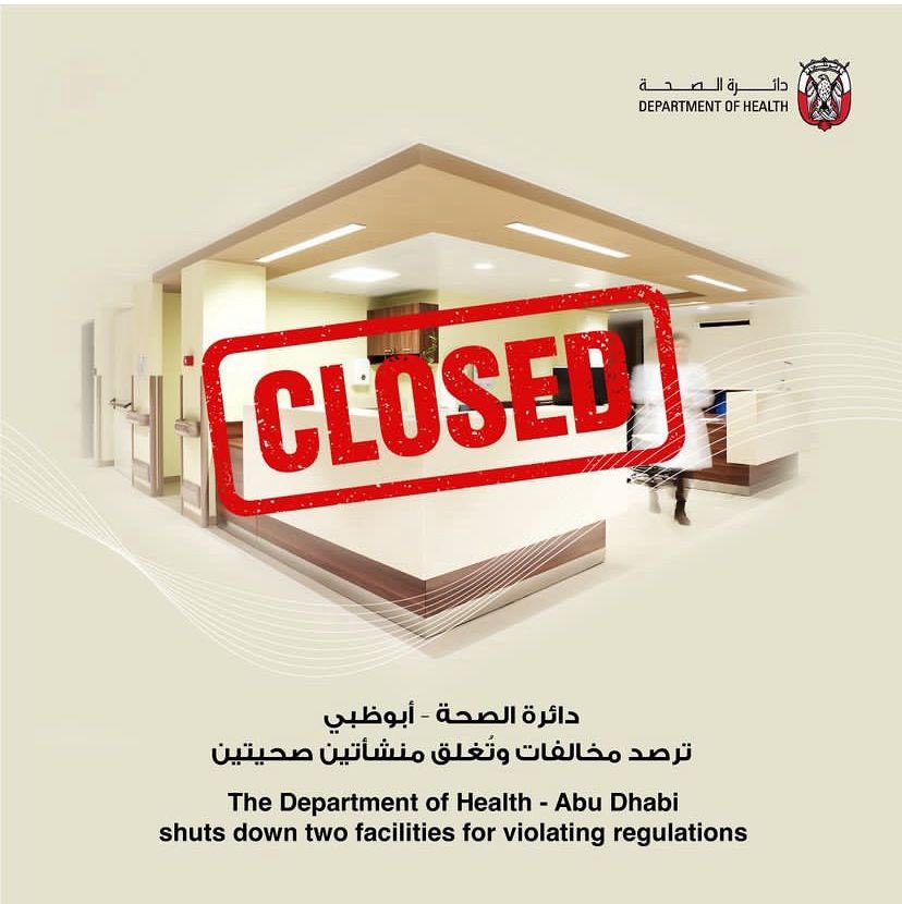 أغلقت دائرة الصحة - أبوظبي، الجهة التنظيمية لقطاع الرعاية الصحية في إمارة أبوظبي، منشأتين صحيتين مؤقتاً عقب رصد فريق جودة الرعاية الصحية في الدائرة لعدد من المخالفات لدى المنشأتين، حيث تقرر إغلاق مركز طبي إلى حين الانتهاء من التحقيقات والإجراءات التنظيمية والقانونية ذات الصلة بالمخالفات المالية التي تم رصدها، وكذلك إغلاق مركز لجراحة اليوم الواحد لرصد مخالفات تُشكل خطراً جسيماً على صحة وسلامة المجتمع.