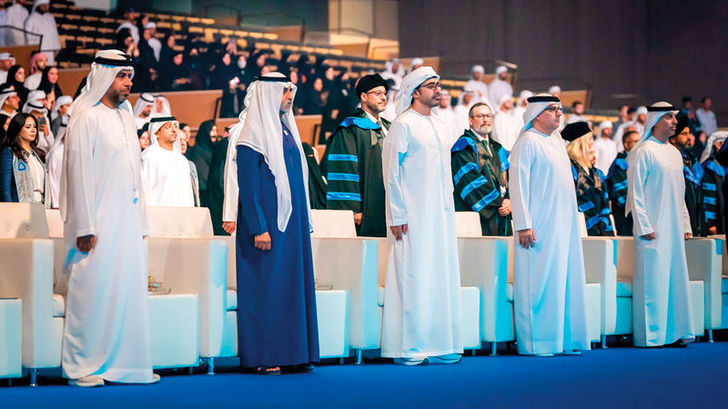 حضر الحفل الذي أقيم في مركز أبوظبي الوطني للمعارض «أدنيك»، الشيخ نهيان بن مبارك آل نهيان، وزير التسامح والتعايش، ووزير التربية والتعليم، الدكتور أحمد بن عبدالله حميد بالهول الفلاسي، ووزير الموارد البشرية والتوطين رئيس مجمع كليات التقنية العليا، الدكتور عبدالرحمن العور، ومدير مجمع كليات التقنية العليا، الدكتور فيصل العيان وعدد من كبار الشخصيات والمسؤولين، وأعضاء الهيئتين الإدارية والأكاديمية، وأولياء أمور الطلبة الخريجين. وقال مدير مجمع كليات التقنية العليا الدكتور فيصل العيان إن النوعية هي رهان القيادة، وهذا الفكر الذي آمن بالإنسان هو ما قاد ابن الإمارات للتحدي والتميز وتحقيق الإنجازات، متقدماً بأسمى آيات الشكر والعرفان للقيادة الحكيمة، وعلى رأسها صاحب السمو الشيخ محمد بن زايد آل نهيان، رئيس الدولة، على الدعم المستمر واللامحدود لكليات التقنية العليا، والذي مكنها من أداء رسالتها ودورها بنجاح ورفد سوق العمل بالكفاءات النوعية في مختلف المجالات والقادرة على المشاركة في التنمية الوطنية. وأضاف أن التزام الكليات بالتطوير المستمر أساسي في عملية إعداد الكفاءات وفق متطلبات كل مرحلة، مشيراً إلى الاستراتيجية الجديدة للكليات «نحن من نصنع المستقبل 2023» التي جاءت لتعزز التعليم التطبيقي وتتماشى مع الطموحات الوطنية وتواكب المتغيرات في سوق العمل، حيث اعتمدت تلك الاستراتيجية على ركيزتي الشمولية والتكاملية بما يتيح للكليات إعداد كوادر المستقبل من حملة البكالوريوس التطبيقي والدبلوم المهني، بشراكة فاعلة مع قطاعات العمل العامة والخاصة، لبناء الخبرات وتعزيز فرص التوظيف للخريجين بوصفه الخيار الأول لسوق العمل.