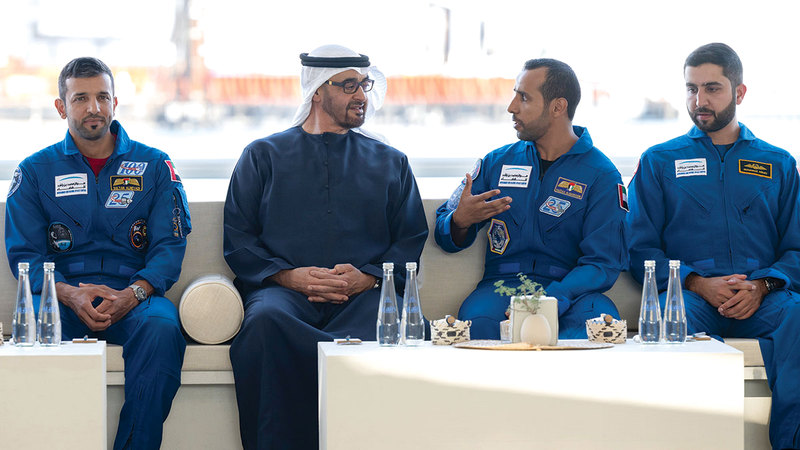 استقبل صاحب السمو الشيخ محمد بن زايد آل نهيان، رئيس الدولة، أمس، في قصر البحر في أبوظبي، رواد الفضاء كلاً من سلطان النيادي وهزاع المنصوري ومحمد الملا، إضافة إلى أعضاء فريق مهمة «طموح زايد 2» في مركز محمد بن راشد للفضاء.