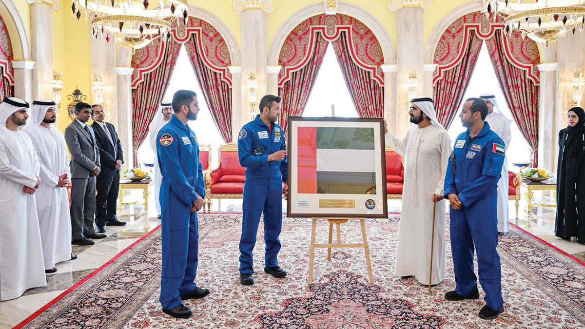 وتلقّى صاحب السمو الشيخ محمد بن راشد آل مكتوم، من رائد الفضاء سلطان النيادي علم دولة الإمارات الذي رافقه خلال مهمته على متن محطة الفضاء الدولية، وهنأ سموه كلاً من رائدي الفضاء النيادي والمنصوري، على نجاحهما في تحقيق طموح زايد، من خلال هذه المهمة العلمية بالغة الأهمية، داعياً إياهما وجميع أعضاء فريق العمل في المركز، إلى مواصلة العمل والعطاء في سبيل تحقيق المزيد من الإنجازات التي تسهم في رفع اسم دولة الإمارات عالياً في هذا المجال.