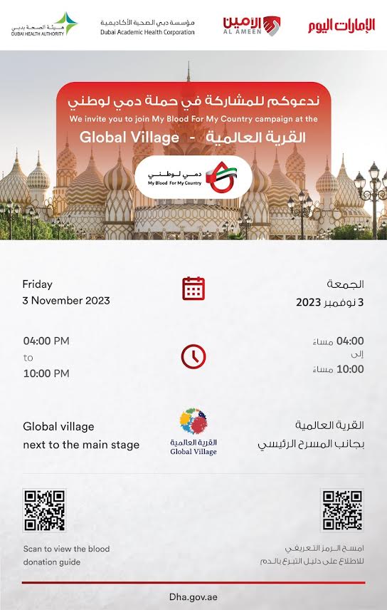 تنطلق غداً بالقرية العالمية في دبي حملة " دمي لوطني" في دورتها ال12، تزامناً مع احتفالات الدولة بيوم العالم، وتستقبل المتبرعين من زوار القرية بدء من الساعة الـ4 مساءً، وحتى الساعة الـ10.