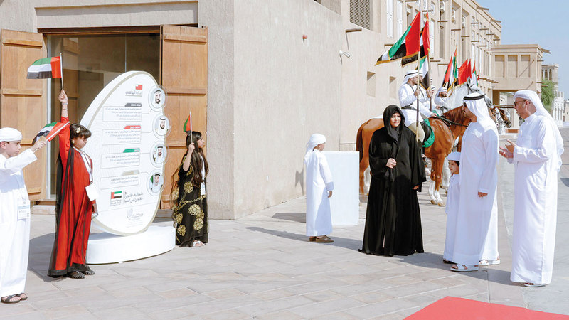 مكتوم بن محمد خلال مشاركته في فعالية رفع عَلم الدولة احتفاءً بـ«يوم العَلم» بحضور لطيفة بنت محمد. وام