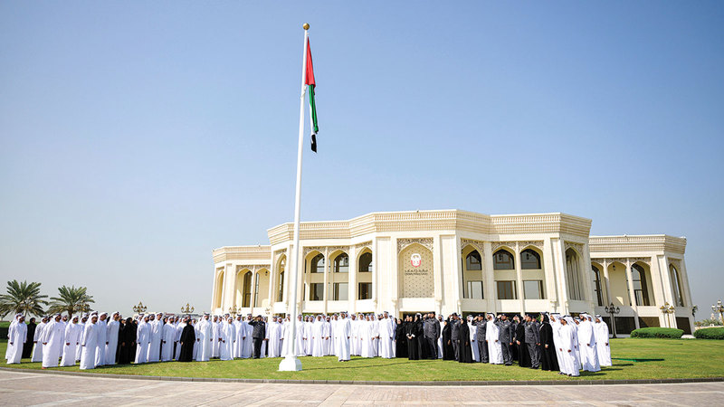 خالد بن محمد بن زايد خلال مراسم رفع علم الدولة أمام مبنى ديوان ولي العهد. وام