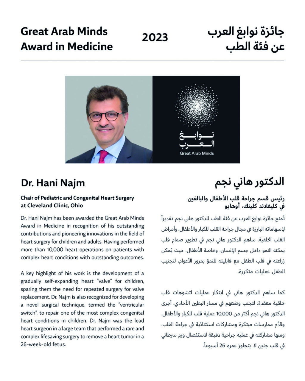 • الدكتور هاني نجم فاز بلقب مبادرة «نوابغ العرب» تقديراً لإسهاماته البارزة في تخصص الجراحة القلبية للأطفال والكبار وابتكاراته الجراحية.