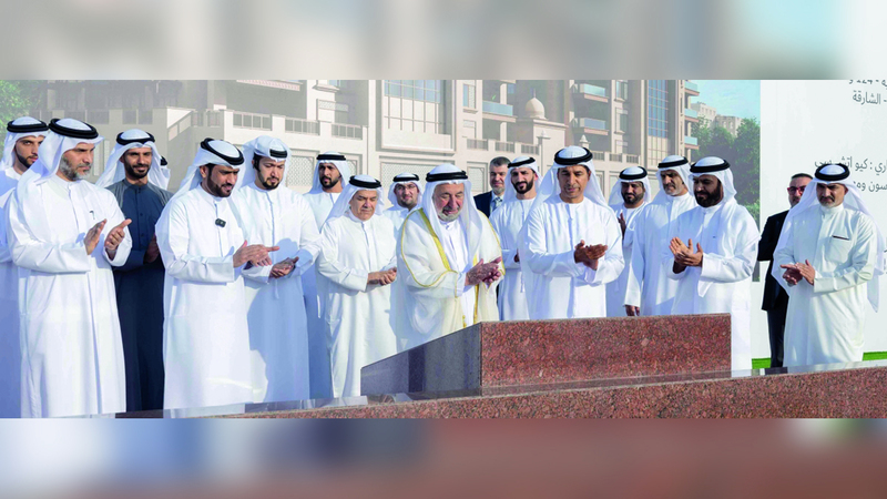 حاكم الشارقة خلال وضع حجر الأساس للمرحلة الأولى من مشروع مجمع جزيرة الحصن السكني. وام