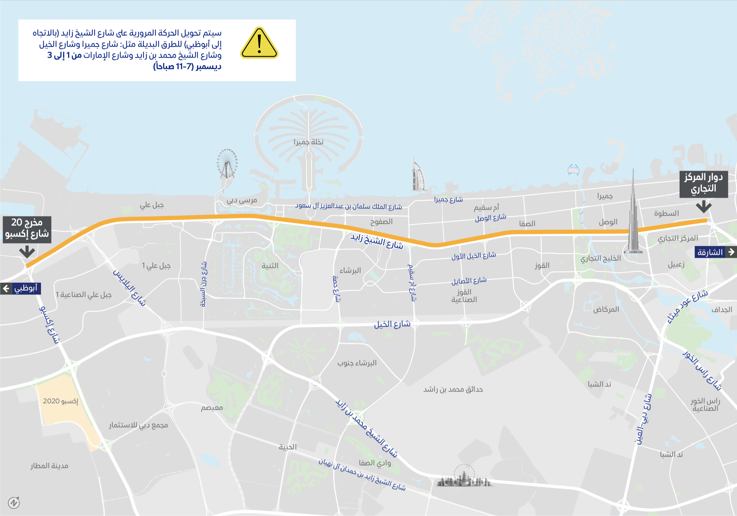 أعلنت هيئة الطرق والمواصلات في دبي، عن تحويل مؤقت للحركة المرورية في إمارة دبي على الطرق المؤدية إلى شارع الشيخ زايد بالاتجاه إلى إمارة أبوظبي في المقطع الممتد من دوار مركز دبي التجاري العالمي إلى تقاطع إكسبو، لمدة 3 أيام اعتباراً من يوم الجمعة الموافق 1 ديسمبر ولغاية يوم الأحد الموافق 3 ديسمبر 2023، خلال الفترة الزمنية الممتدة من الساعة 7:00 صباحاً وحتى الساعة 11:00 صباحاً، وذلك بالتزامن مع استضافة دولة الامارات لمؤتمر الأطراف (كوب 28) في مدينة إكسبو دبي.