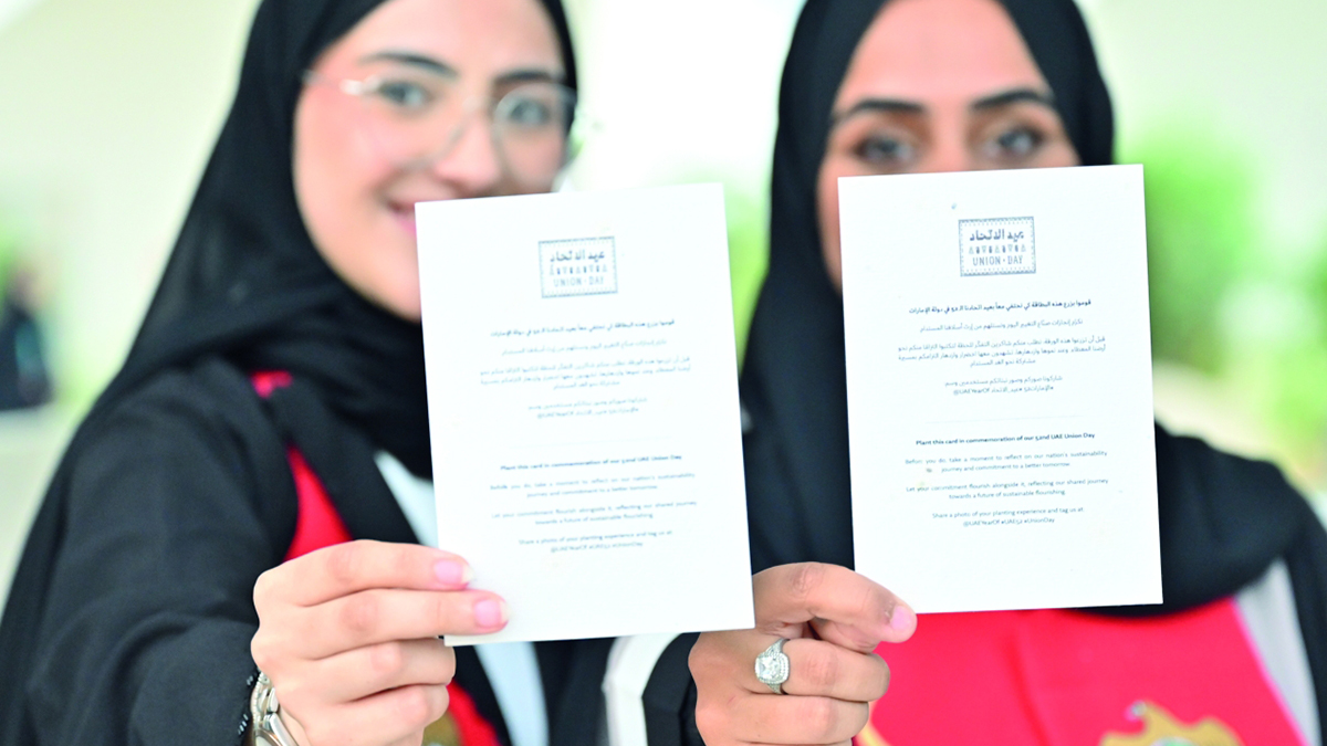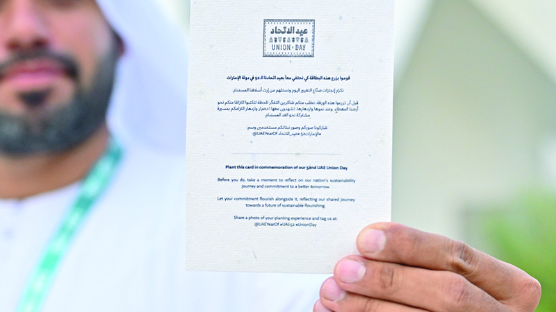 ودُونت على البطاقة عبارة باللغتين العربية والإنجليزية: «قوموا بزرع هذه البطاقة كي نحتفي معاً بعيد اتحادنا الـ52 في دولة الإمارات.. نكرّم إنجازات صنّاع التغيير اليوم، ونستلهم من إرث أسلافنا المستدام. قبل أن تزرعوا هذه الورقة، نطلب منكم شاكرين التفكُّر للحظة لتكتبوا التزاماً منكم نحو أرضنا المعطاء، وعند نموها وازدهارها، تشهدون معها اخضرار وازدهار التزامكم مسيرة مشتركة نحو الغد المستدام».