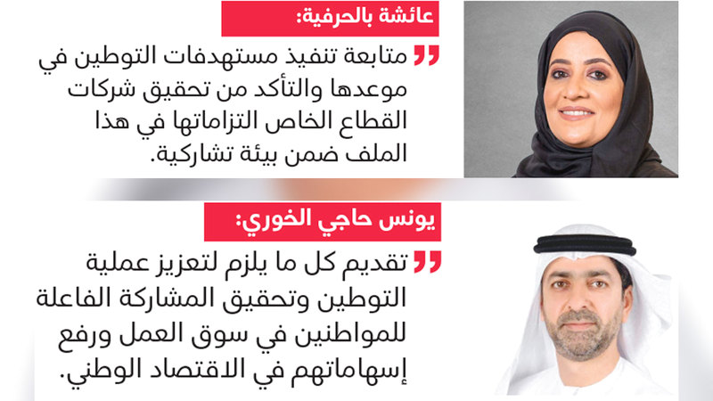 وأوضحت أن «الوزارة ماضية في متابعة تنفيذ مستهدفات التوطين في موعدها، والتأكد من تحقيق شركات القطاع الخاص التزاماتها في هذا الملف، ضمن بيئة تشاركية محفّزة، أساسها وعي أصحاب الشركات والقائمين عليها بواقع عملية التوطين، وما تحققه من منافع على صعيد أعمالها، وعبر الامتيازات المقدمة من الوزارة وشركائها في الجهات الحكومية».