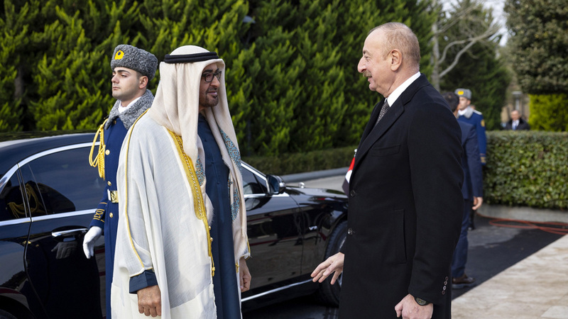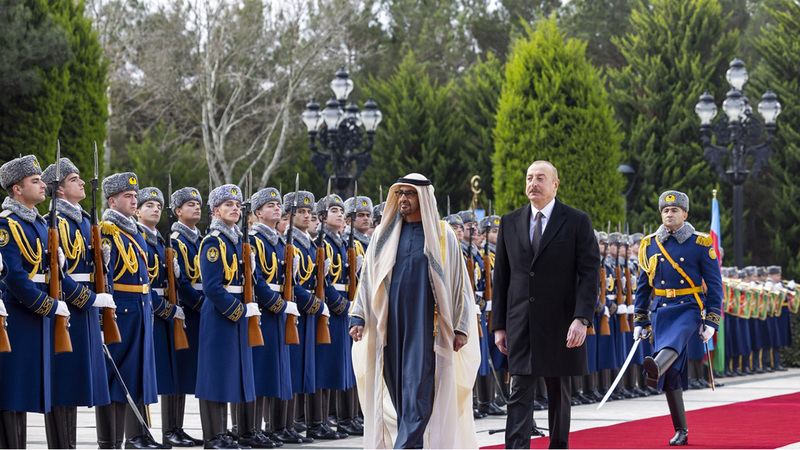 وجرت لصاحب السمو رئيس الدولة ــ لدى وصول موكبه إلى قصر «زوجلوب» الرئاسي في العاصمة باكو ــ مراسم استقبال رسمية، يرافقه الرئيس إلهام علييف، حيث اصطفت ثلة من حرس الشرف تحية لسموه، بعدها عزف السلام الوطني لكل من دولة الإمارات وأذربيجان. وصافح سموه كبار مستقبليه من الوزراء والمسؤولين في أذربيجان. كما صافح الرئيس الأذري الوفد المرافق لصاحب السمو الشيخ محمد بن زايد آل نهيان.