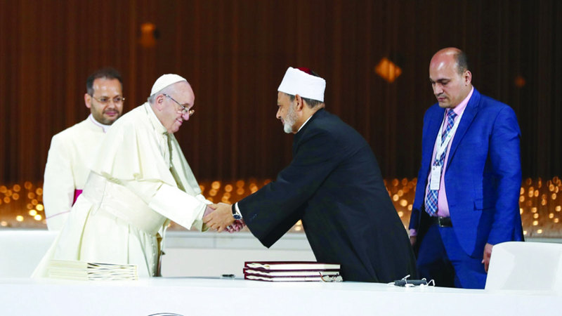 «وثيقة الأخوة الإنسانية » وقعها في أبوظبي عام 2019 الدكتور أحمد الطيب شيخ الأزهر والبابا فرنسيس بابا الكنيسة الكاثوليكية. أرشيفية
