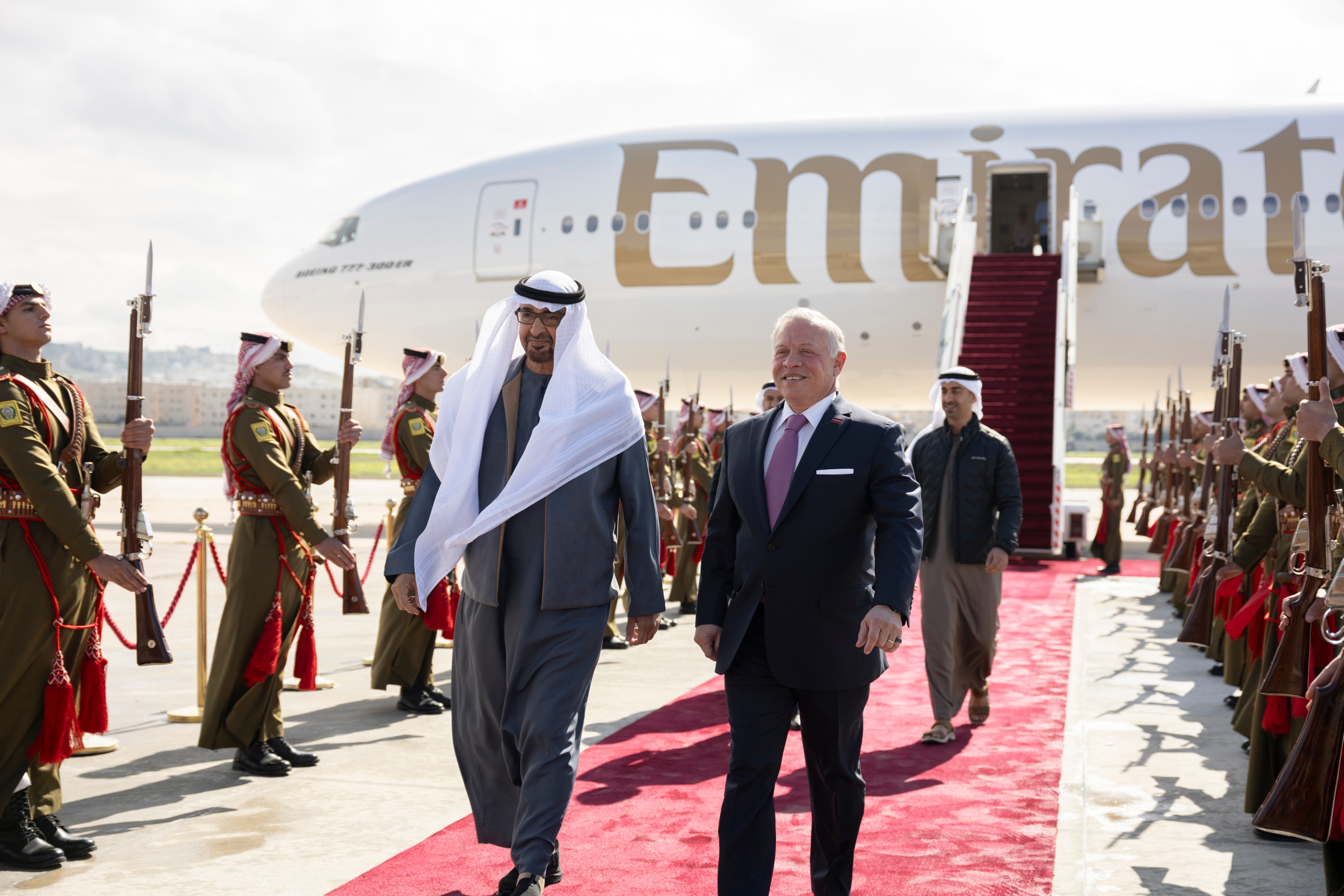 رئيس الدولة يصل الأردن في زيارة أخوية.. وعبد الله الثاني في مقدمة مستقبليه