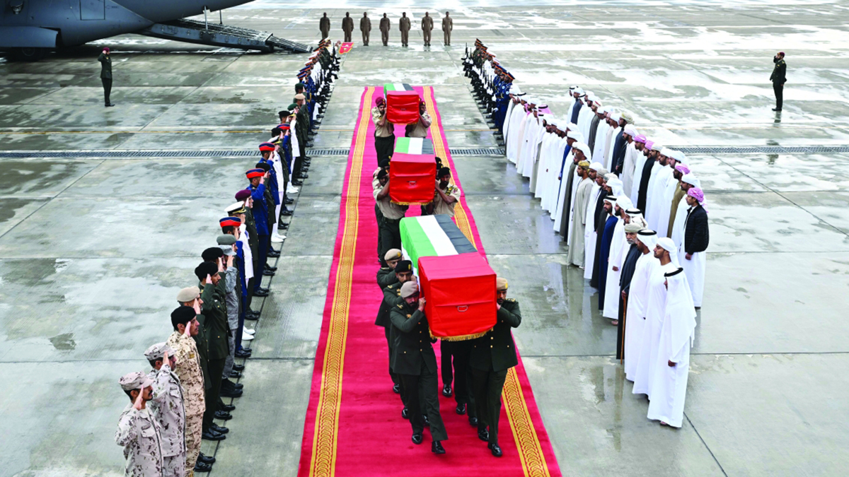 وصلت إلى مطار البطين الخاص في أبوظبي، صباح أمس، جثامين شهداء الوطن الأبرار الأربعة: (العقيد محمد المنصوري، والوكيل/1 محمد الشامسي، والوكيل/1 خليفة البلوشي، والعريف سليمان الشحي)، وذلك على متن طائرة عسكرية تابعة للقوات المسلحة.