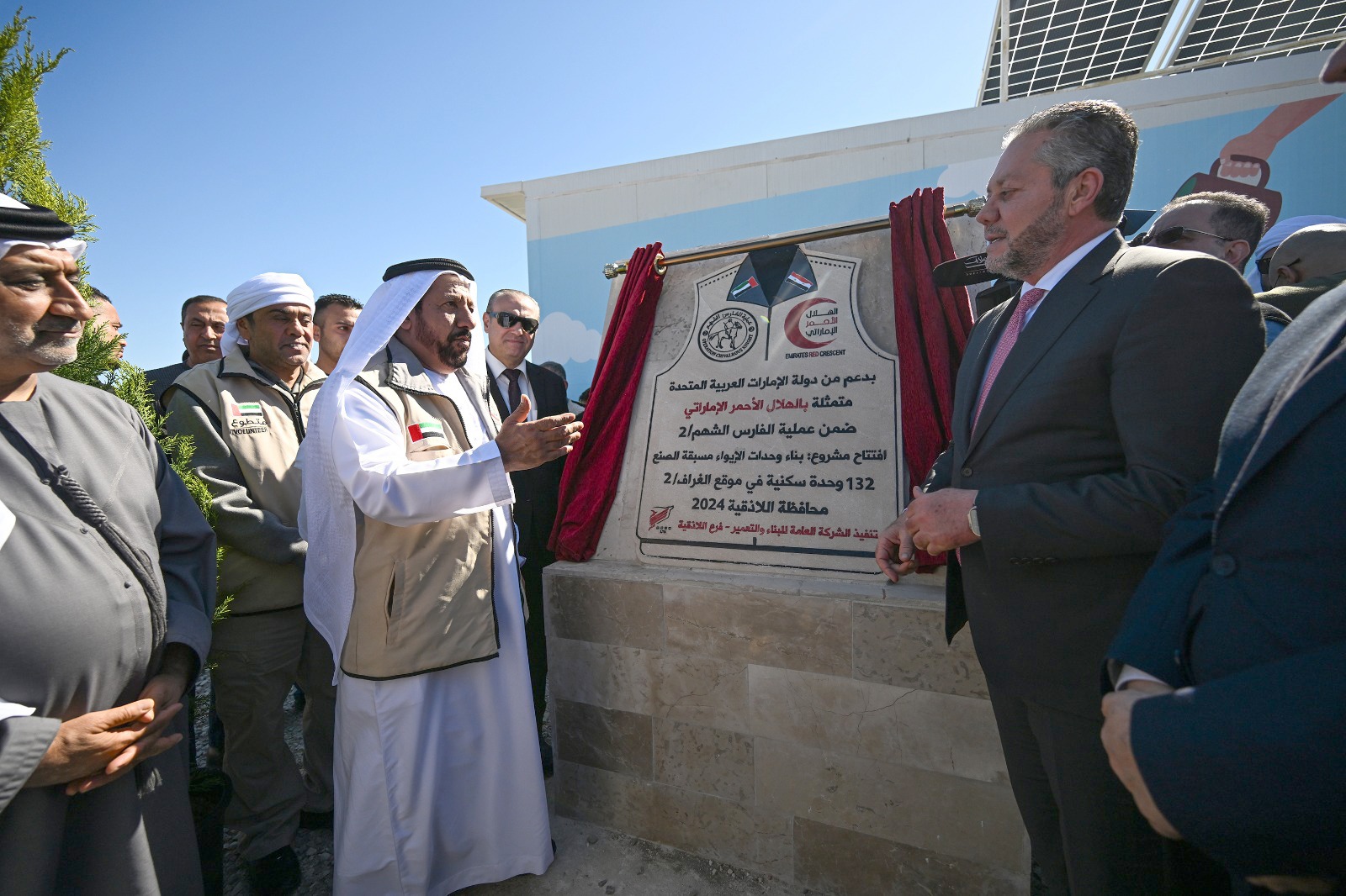 شارك في افتتاح الوحدات السكنية وفد من الهيئة يزور سوريا حاليا برئاسة سعادة راشد مبارك المنصوري الأمين العام المكلف للهلال الأحمر، وكان في استقباله سعادة حسن أحمد الشحي سفير دولة الإمارات العربية المتحدة في دمشق ومعالي الدكتور حسن الغباش وزير الصحة في الجمهورية العربية السورية ومحافظ اللاذقية عامر اسماعيل هلال بحضور عدد من المسؤولين والأهالي في المحافظة.