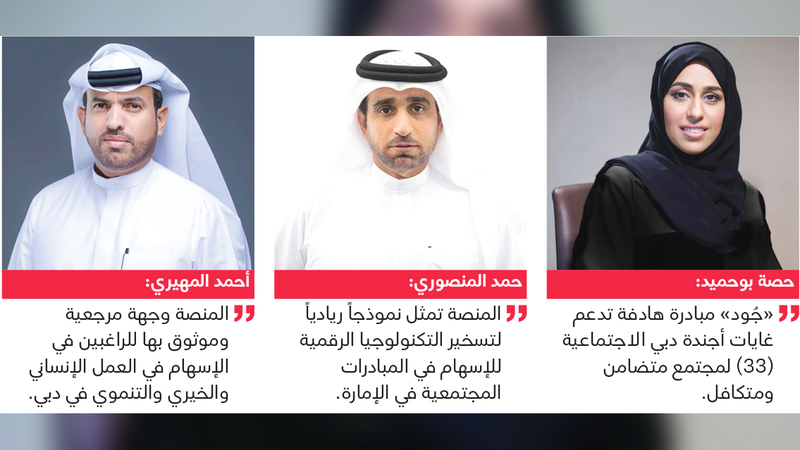 وأكدت مدير عام هيئة تنمية المجتمع في دبي، حصة بنت عيسى بوحميد، أن منصة «جُود» تشكل قناة جامعة ومضمونة ومبتكرة ومتطورة توفرها دبي للمؤسسات والشركات وقطاعات الأعمال والأفراد لتسهيل و«مأسسة» الإسهام في مشروعات مجتمعية مستدامة في مجالات حيوية، في مقدمتها التعليم والصحة والدعم الاجتماعي.