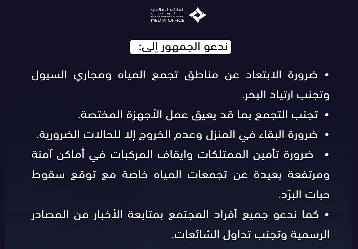 قال المكتب الإعلامي لحكومة دبي: نظراً لتوقع تأثر الدولة بحالة عدم استقرار جوي قوية من مساء اليوم الجمعة 8 مارس إلى ظهر يوم الأحد 10 مارس، مصحوبة بسقوط أمطار شديدة الغزارة مع برق ورعد وسقوط البَرد أحياناً، تؤدي إلى تجمع المياه وجريان الأودية الجارفة، وفيضان بعض السدود وهبوب الرياح القوية المصاحبة للسحب الركامية، وتدني مدى الرؤية الأفقية، وتطاير بعض الأجسام الصلبة. ندعو الجمهور إلى: