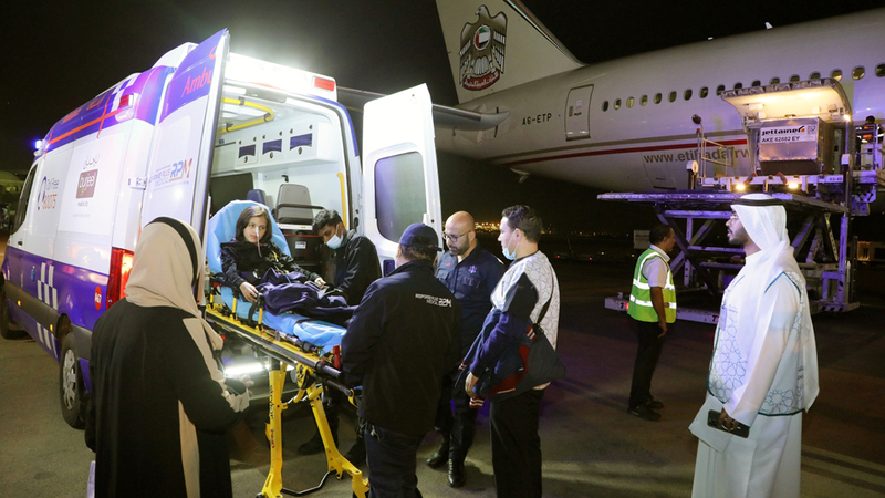 وحطّت الطائرة القادمة من مطار العريش في مصر بمطار زايد الدولي وعلى متنها 98 شخصاً، منهم 40 من الأطفال الذين هم في أمسّ الحاجة للمساعدة الطبية، ممن يعانون إصابات وحروقاً شديدة، ومن مرضى السرطان الذين يحتاجون إلى علاج حثيث، مع 58 مرافقاً من عائلاتهم.