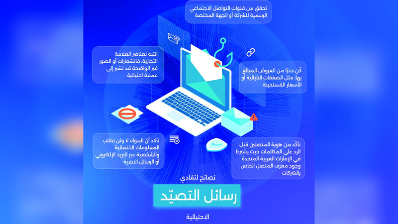 وأطلق مجلس الأمن السيبراني لحكومة دولة الإمارات أخيراً حملة توعوية، تستهدف المؤسسات الحكومية والخاصة، وجميع أفراد المجتمع، تحت عنوان «الحملة الوطنية للأمن السيبراني.. عامٌ من الوعي والتثقيف الرقمي»، وتسعى إلى تعزيز الوعي بمخاطر الفضاء الإلكتروني، والسبل المختلفة للحماية من الهجمات السيبرانية، وتدعو إلى أهمية أخذ الحيطة والحذر لتفادي الوقوع ضحية لهجمات التصيد والاحتيال الإلكتروني، التي تستخدم التكنولوجيا لخداع المستخدمين الرقميين للحصول على معلوماتهم وبياناتهم الشخصية.
