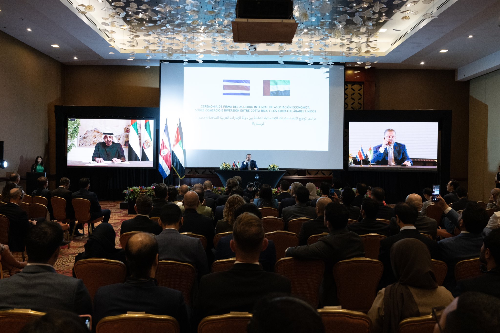 شهد صاحب السمو الشيخ محمد بن زايد آل نهيان، رئيس الدولة، وفخامة الرئيس رودريغو تشافيس روبلز، توقيع اتفاقية الشراكة الاقتصادية الشاملة بين الإمارات وكوستاريكا.