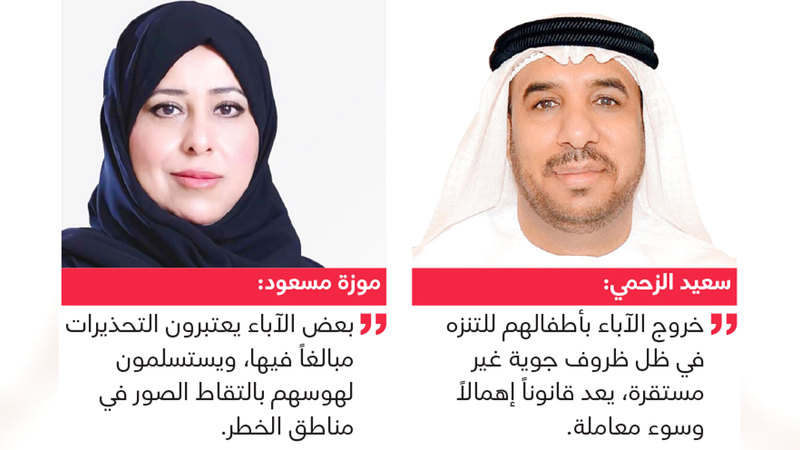 وأشارت إلى أن بعض الآباء يتجاهلون التحذيرات والتوجيهات الصادرة عن الجهات المسؤولة، التي تُصدر تعليمات مسبقة بشأن الكوارث الطبيعية والمنخفضات الجوية، عازية هذا التصرف إلى اعتبارهم أن تلك التحذيرات مبالغ فيها، ويستسلمون لهوسهم بالتقاط الصور في مناطق الخطر، ما يُعرّضهم لحوادث.