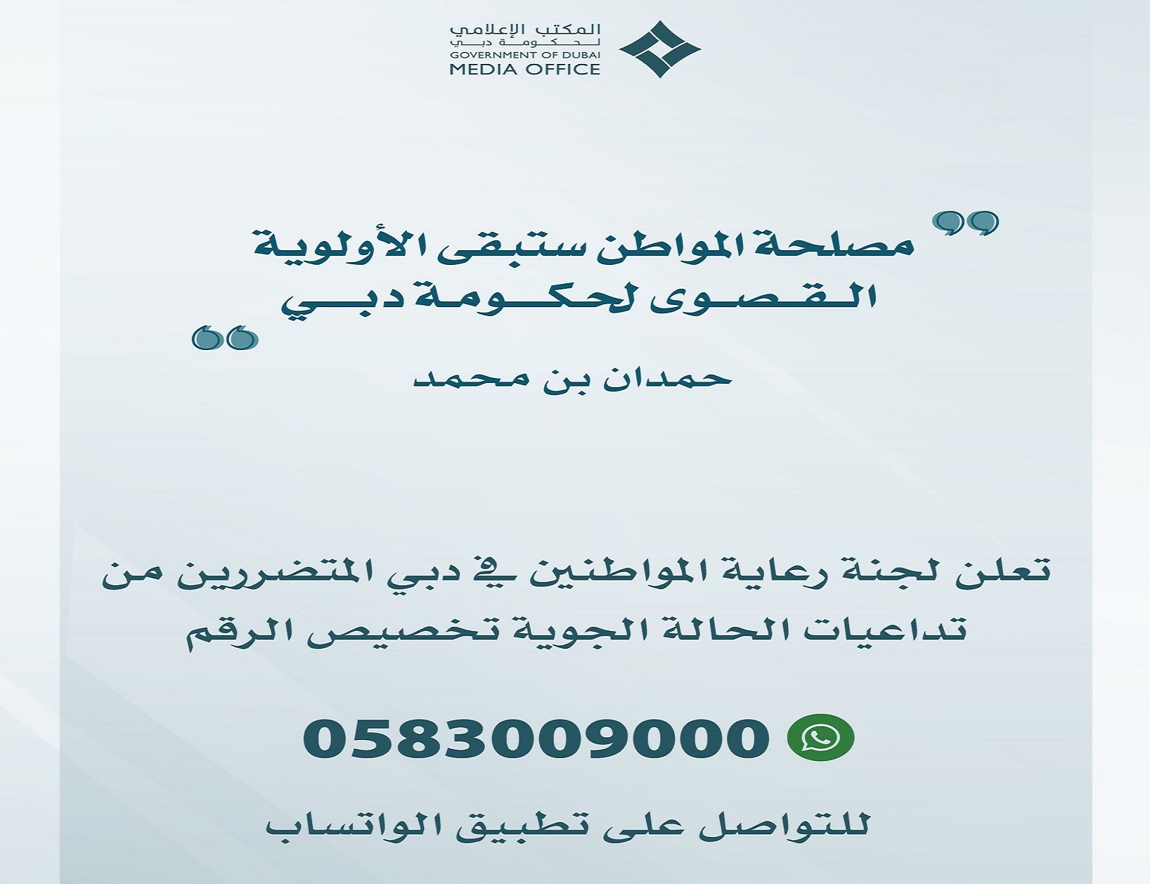 تخصيص رقم على تطبيق "واتساب" لاستقبال طلبات الدعم من المواطنين المتضررين في دبي من الأحوال الجوية الأخيرة