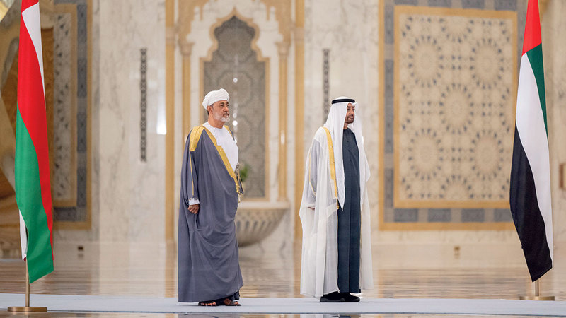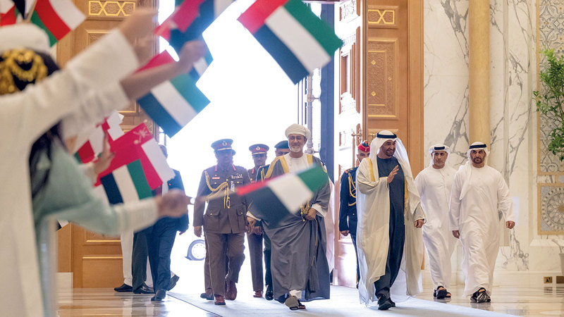 وكان صاحب السموّ الشيخ محمد بن زايد آل نهيان، رئيس الدولة، حفظه الله، استقبل أخاه صاحب الجلالة السلطان هيثم بن طارق سلطان عُمان الشقيقة، الذي بدأ زيارة دولة، أمس، إلى دولة الإمارات العربية المتحدة.