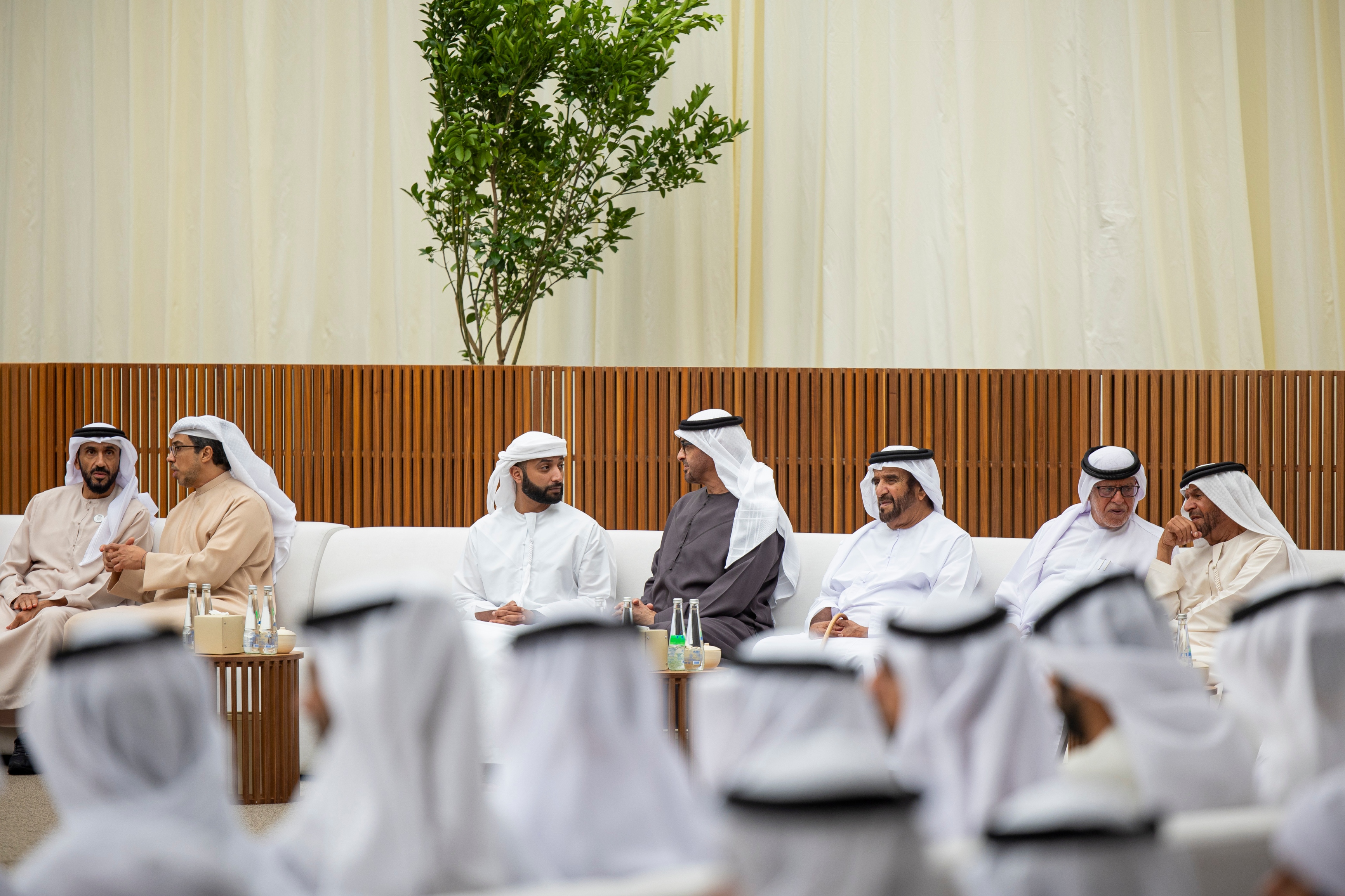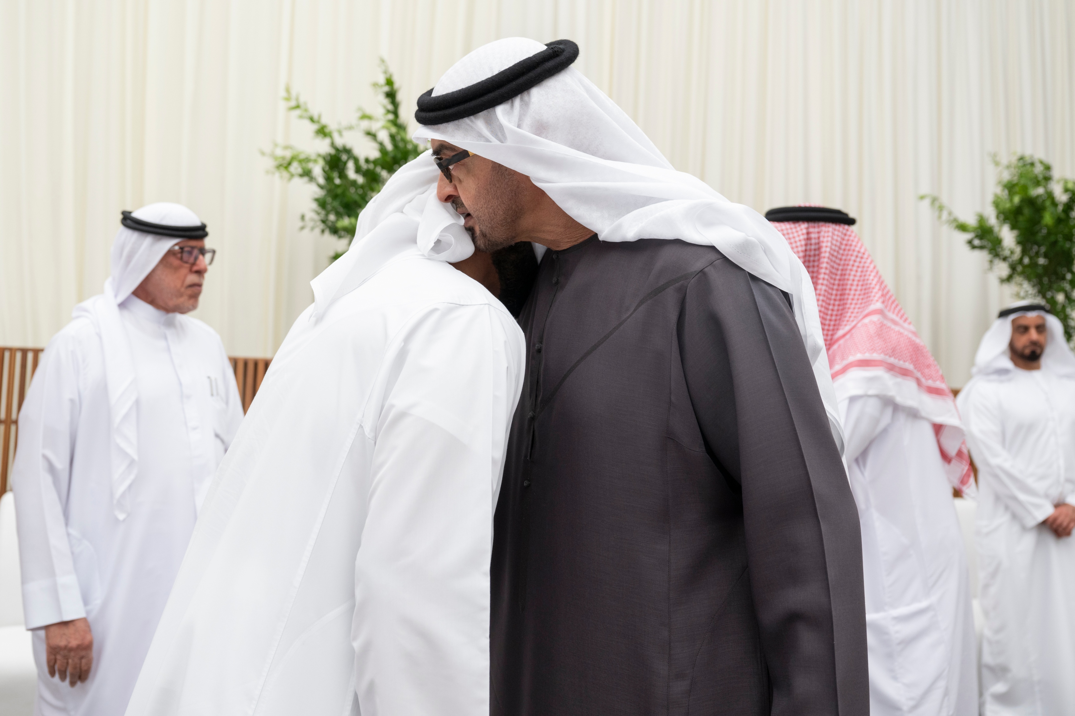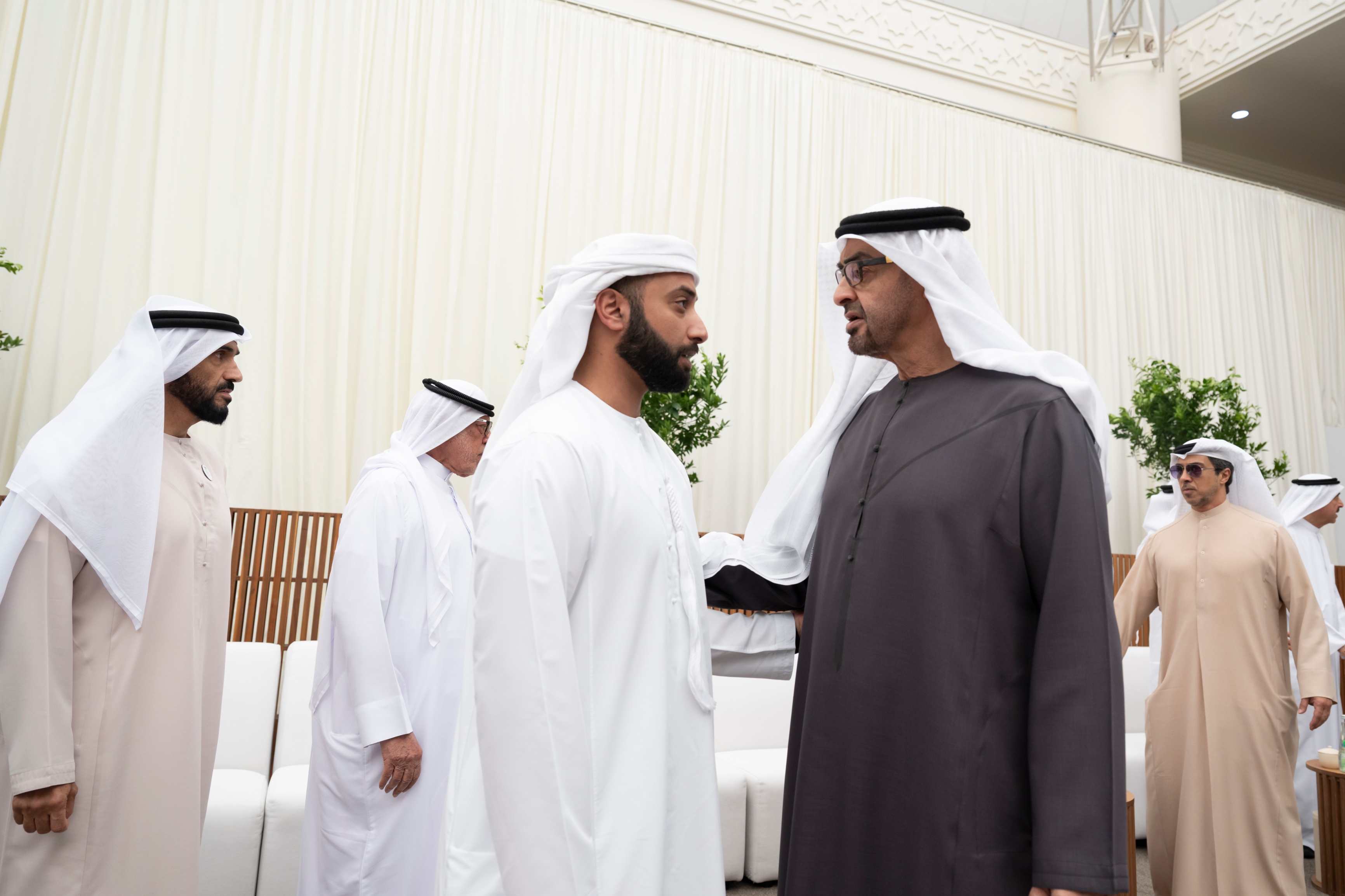 وتقبل التعازي إلى جانب صاحب السمو رئيس الدولة كل من..سمو الشيخ منصور بن زايد آل نهيان نائب رئيس الدولة نائب رئيس مجلس الوزراء رئيس ديوان الرئاسة وسمو الشيخ خالد بن محمد بن زايد آل نهيان ولي عهد أبوظبي وسمو الشيخ هزاع بن زايد آل نهيان نائب حاكم إمارة أبوظبي وسمو الشيخ طحنون بن زايد آل نهيان نائب حاكم إمارة أبوظبي مستشار الأمن الوطني وسمو الشيخ حمدان بن زايد آل نهيان ممثل الحاكم في منطقة الظفرة وسمو الشيخ سيف بن محمد آل نهيان وسمو الشيخ سرور بن محمد آل نهيان وسمو الشيخ نهيان بن زايد آل نهيان رئيس مجلس أمناء مؤسسة زايد بن سلطان آل نهيان للأعمال الخيرية والإنسانية والفريق سمو الشيخ سيف بن زايد آل نهيان نائب رئيس مجلس الوزراء وزير الداخلية وسمو الشيخ حامد بن زايد آل نهيان وسمو الشيخ عمر بن زايد آل نهيان نائب رئيس مجلس أمناء مؤسسة زايد بن سلطان آل نهيان للأعمال الخيرية والإنسانية وسمو الشيخ خالد بن زايد آل نهيان رئيس مجلس إدارة مؤسسة زايد العليا لأصحاب الهمم وسمو الشيخ الدكتور سلطان بن خليفة آل نهيان مستشار صاحب السمو رئيس الدولة وسمو الشيخ محمد بن خليفة آل نهيان وسمو الشيخ ذياب بن محمد بن زايد آل نهيان نائب رئيس ديوان الرئاسة للشؤون التنموية وأسر الشهداء وسمو الشيخ حمدان بن محمد بن زايد آل نهيان والشيخ الدكتور خالد بن سلطان بن زايد آل نهيان ومعالي الشيخ نهيان بن مبارك آل نهيان وزير التسامح والتعايش ومعالي الشيخ محمد بن حمد بن طحنون آل نهيان مستشار الشؤون الخاصة في ديوان الرئاسة وعدد من الشيوخ.