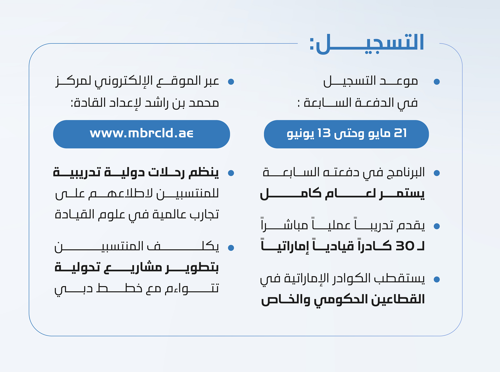 أعلن مركز محمد بن راشد لإعداد القادة التابع للمكتب التنفيذي لصاحب السمو الشيخ محمد بن راشد آل مكتوم، نائب رئيس الدولة رئيس مجلس الوزراء حاكم دبي، رعاه الله، عن فتح باب التسجيل في الدفعة السابعة من برنامج "محمد بن راشد لإعداد القادة "، والذي يهدف إلى تطوير وتعزيز المهارات القيادية لدى القادة الإماراتيين الطموحين وتأهيلهم للمناصب القيادية، وإدارة المشاريع الاستراتيجية والتحولية في الدولة.