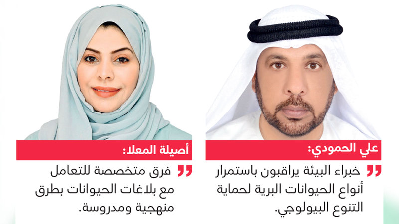 وأفادت مديرة هيئة الفجيرة للبيئة، أصيلة المعلا، لـ«الإمارات اليوم»، بأن الهيئة مجهزة بفرق متخصصة للتعامل مع بلاغات الحيوانات بطرق منهجية ومدروسة، للحفاظ على سلامة وأمن البيئة والإنسان والحيوان، مؤكدة التزام الهيئة في الحفاظ على التوازن البيئي في الإمارة. وأشارت إلى أن الفريق البيولوجي المكون من باحثين بيئيين، يستجيب بشكل فوري للبلاغات التي يتلقاها الخط الساخن (800368) المخصص للإبلاغ عن الحيوانات البرية والسامة والخطرة والطيور، إضافة إلى الحيوانات النادر وجودها في الإمارة، ويقوم بمعالجتها بكفاءة عالية، والتعامل معها وإنجازها بوقت قياسي، لافتة إلى أن الهيئة تسعى دائماً لتحقيق أعلى مستويات الأداء في تنفيذ مهامها وأداء واجباتها، خصوصاً في مجال التعامل مع الحيوانات المفترسة والخطرة، مع التزامها بالمعايير المهنية والإجرائية.