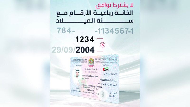 أكدت الهيئة الاتحادية للهوية والجنسية والجمارك وأمن المنافذ، أنه لا يشترط توافق الخانة رباعية الأرقام في رقم بطاقة الهوية مع سنة الميلاد، موضحة أن رقم البطاقة مكون من 15 خانة، ويتم اختياره بطريقة إلكترونية، فيما يتوافر تاريخ الميلاد على وجه البطاقة.