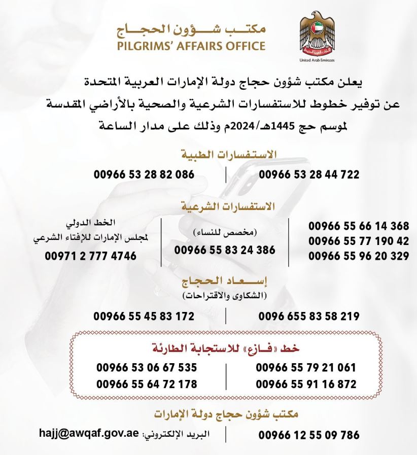 أطلق مكتب شؤون حجاج دولة الإمارات، منصة "فازع" للاستجابة للبلاغات الطارئة من قبل حجاج دولة الإمارات العربية المتحدة على مدار الساعة.