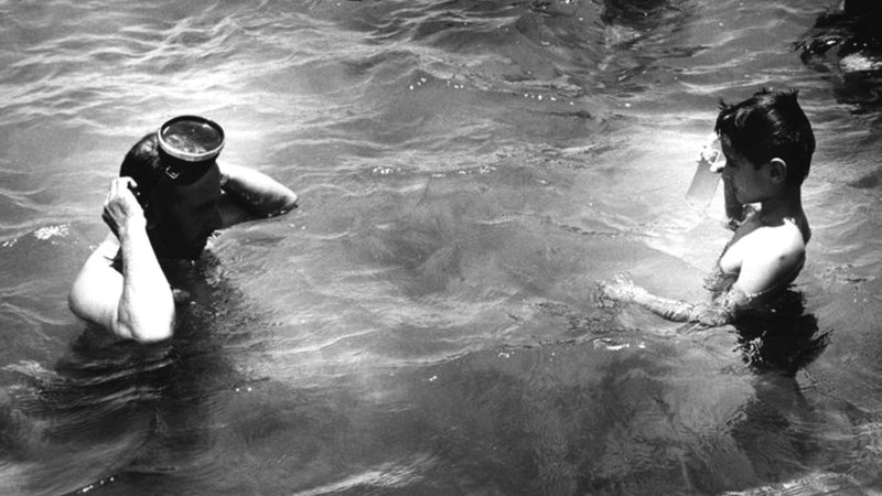 صورة نشرها محمد بن زايد مع مؤسس الدولة وهو يعلمه السباحة والغطس. من المصدر