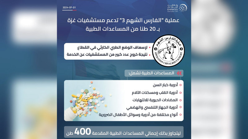 جدير بالذكر أن عملية «الفارس الشهم 3» قدمت خلال الفترة الماضية المساعدات الطبية للمستشفيات كافة في قطاع غزة، من ضمنها شحنات الأدوية وسيارات الإسعاف، والأجهزة الطبية.