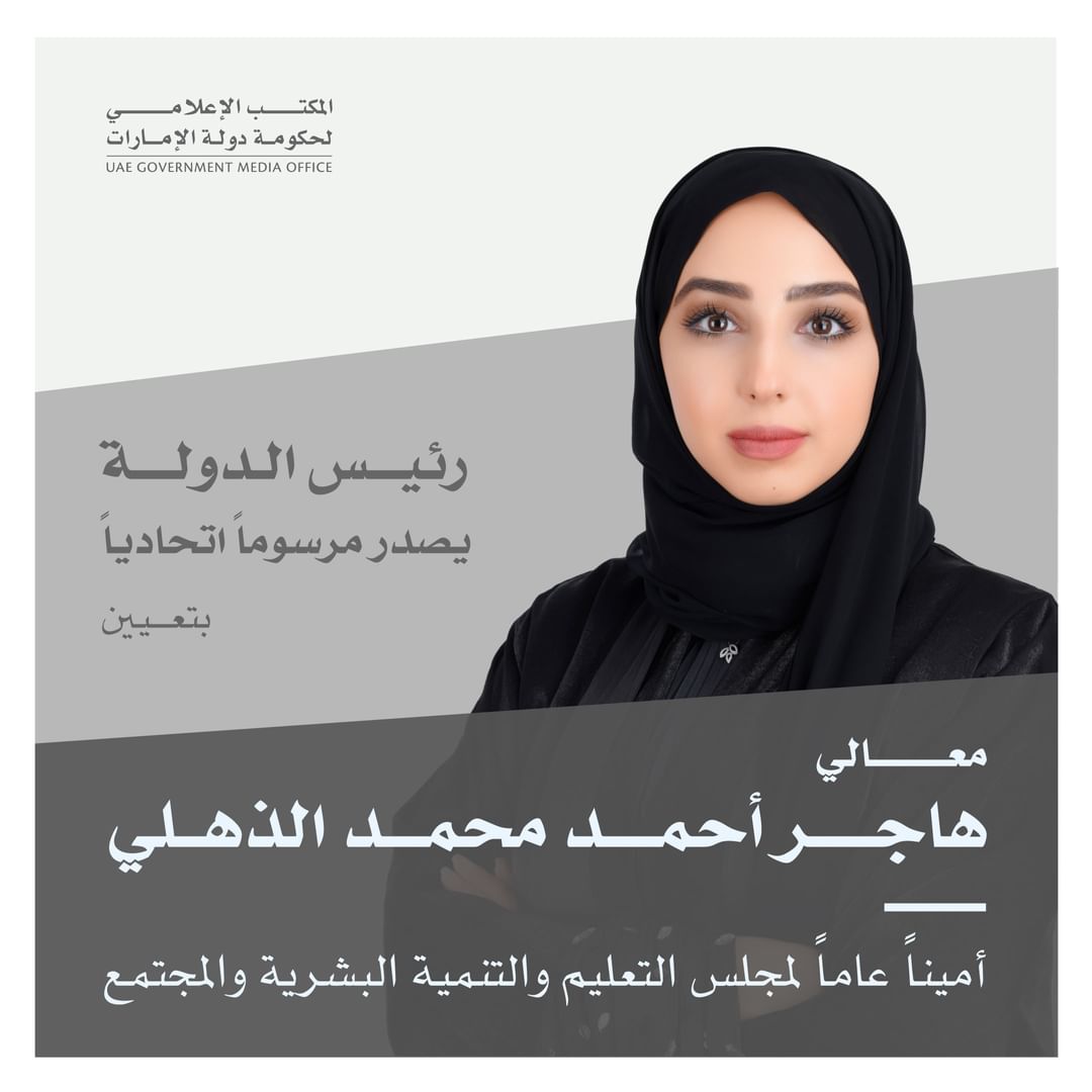 أصدر صاحب السمو الشيخ محمد بن زايد آل نهيان رئيس الدولة، حفظه الله، مرسوماً اتحادياً بتعيين معالي هاجر أحمد محمد الذهلي أميناً عاماً لمجلس التعليم والتنمية البشرية والمجتمع، بدرجة وزير.